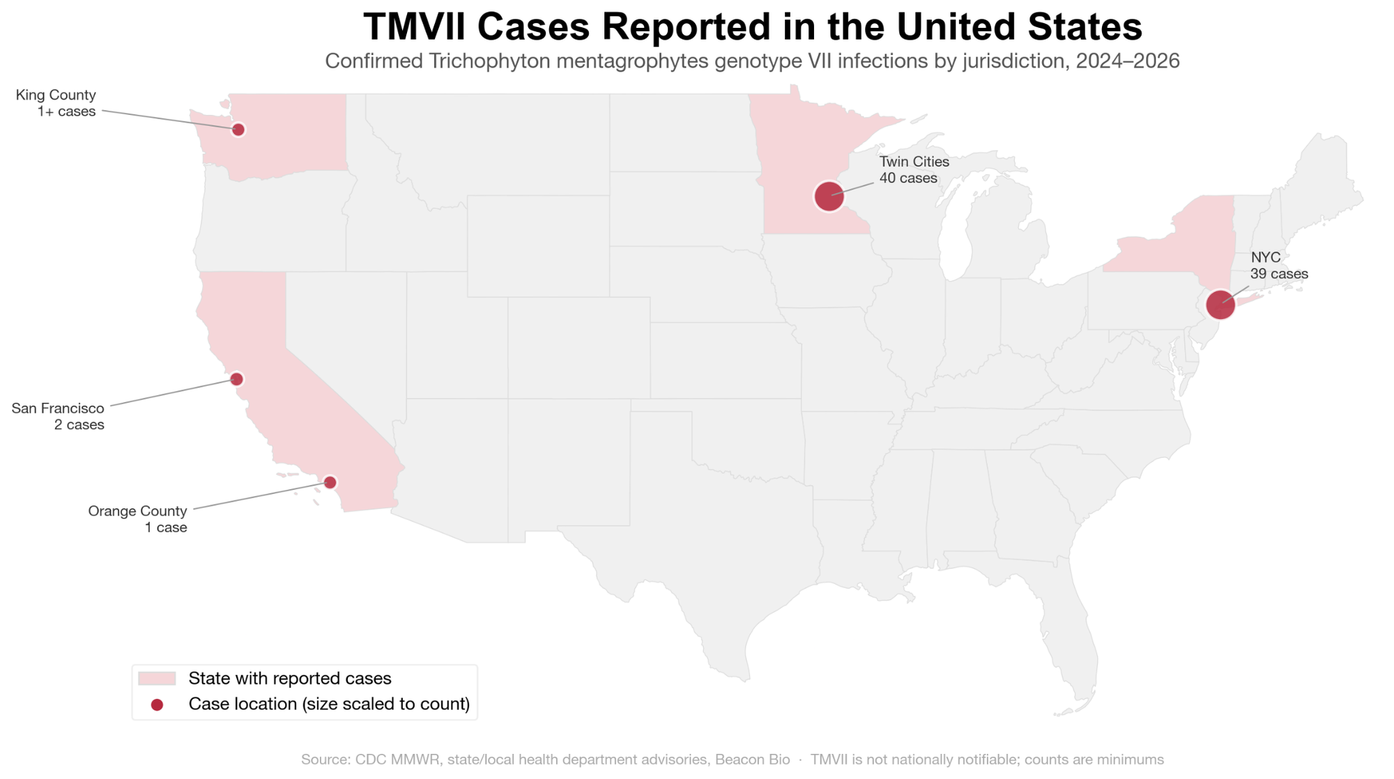 The Minnesota cluster is the largest documented U.S. outbreak, though this may reflect better surveillance rather than true case burden. Notably, neither San Francisco patient reported recent international travel, suggesting domestic transmission chains. The CDC notes that cases have been identified in "multiple U.S. cities" but the strain is "not yet widespread nationally." Because dermatophyte infections are not nationally notifiable, there is no comprehensive case count. The CDC maintains an Emerging Disease Registry for case reporting and offers clinical consultation ([email protected], 404-639-5168).