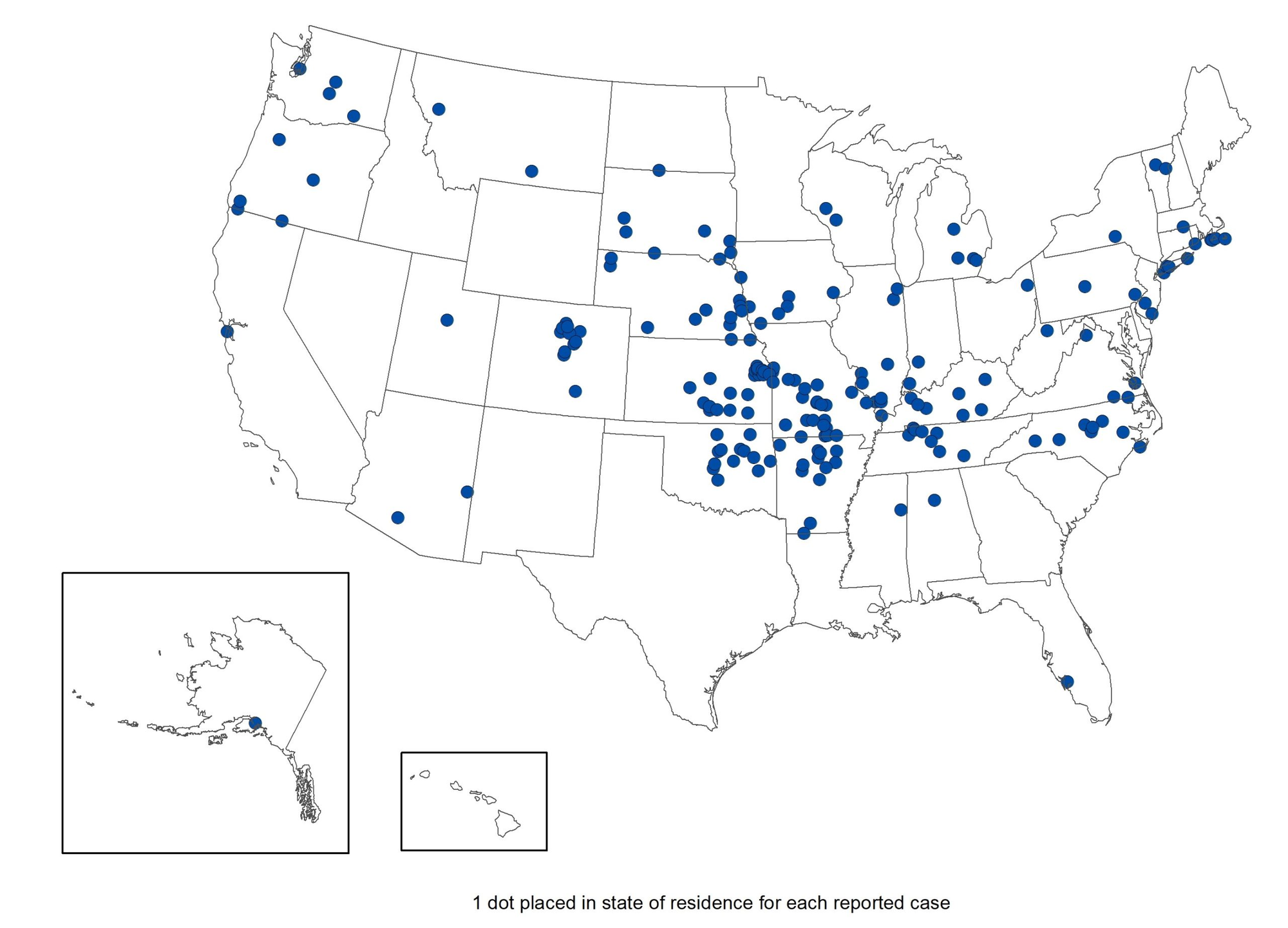 For the past 40 years, there have been roughly 15o-300 cases reported each year in the United States. These have primarily occurred in the south-central United States, Pacific Northwest, and Massachusetts, but with locally-acquired cases reported in every state except Hawaii.